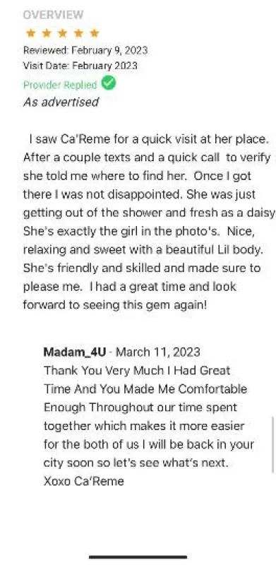 TER ID:383440 https://privatedelights.ch/profile/Madam_4U https://preferred411.com/P408865 Im the unforgettable Ca'Reme. I would love to have a Relaxing, Erotic, Exhilarating time with you π A Massage,Dinner, Shopping, A Beauty on your arms For A Special Event, Or Just companionship I'll give you what you've been missing. Indulge yourself in the finest a woman can offer you. π―% INDEPENDENT π―% REAL PHOTOS I'm pleased to welcome you to my post dedicated to Discerning Man In Search Of An Elegant Beauty an Exqusite of AnAfrican-American queen. I have a gorgeous smile complemented by bedroom eyes A classic beauty standin at 5'2 all natural 34B smooth chocolate skin. I'm Romantic, Seductive, and master the art of pleasing a man. Allow me to seduce you. Let's enjoy the time together the fun of frivolous seduction. I look forward to meeting your Acquaintance... Ca'Reme Discretion Class is Expected Returned π